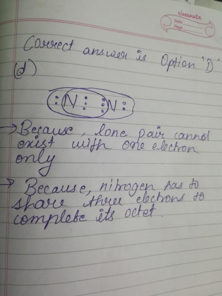 Which of the following is the correctrepresentation of electron dot structure of nitrogen?a)b)c)d)Correct answer is option 'D'. Can you explain this answer? for Class 10 2025 is part of Class 10 preparation. The Question and answers have been prepared according to the Class 10 exam syllabus. Information about Which of the following is the correctrepresentation of electron dot structure of nitrogen?a)b)c)d)Correct answer is option 'D'. Can you explain this answer? covers all topics & solutions for Class 10 2025 Exam. Find important definitions, questions, meanings, examples, exercises and tests below for Which of the following is the correctrepresentation of electron dot structure of nitrogen?a)b)c)d)Correct answer is option 'D'. Can you explain this answer?.