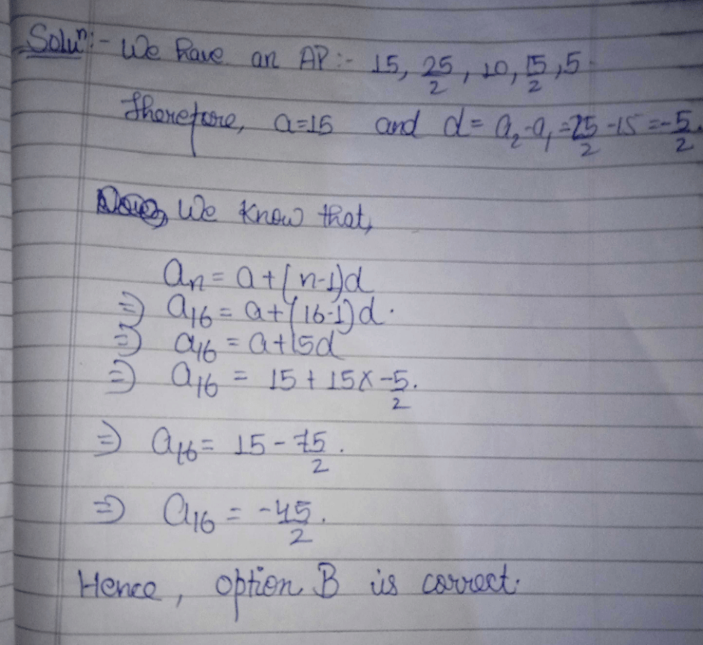 The 16th term of thea)45/2b)-45/2c)105/2d)-25Correct answer is option 'B'. Can you explain this answer? for Class 10 2025 is part of Class 10 preparation. The Question and answers have been prepared according to the Class 10 exam syllabus. Information about The 16th term of thea)45/2b)-45/2c)105/2d)-25Correct answer is option 'B'. Can you explain this answer? covers all topics & solutions for Class 10 2025 Exam. Find important definitions, questions, meanings, examples, exercises and tests below for The 16th term of thea)45/2b)-45/2c)105/2d)-25Correct answer is option 'B'. Can you explain this answer?.