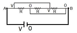 Since all the resistors have same potential difference (= V) across them, they are connected in parallel combination and hence the equivalent resistance across AB will be R/3.