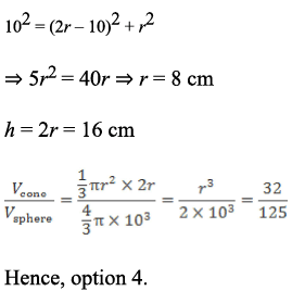 Find important definitions, questions, meanings, examples, exercises and tests below for A solid right circular cone is inscribed inside a hollow sphere of radius 10 cm. The height of the cone is two times its radius (i.e., radius of base of the cone). Find the ratio of volume of the cone to the volume of the sphere.a)32 : 81b)64 : 125c)16 : 125d)32: 125Correct answer is option 'D'. Can you explain this answer?.