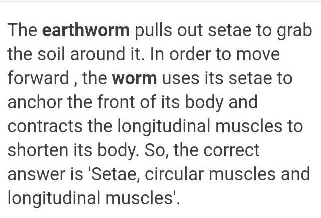 In earthworm locomotion occurs with the helpa)Setae, circular muscles and longitudinal musclesb)Setae and circular musclesc)Setaed)ParapodiaCorrect answer is option 'A'. Can you explain this answer?, a detailed solution for In earthworm locomotion occurs with the helpa)Setae, circular muscles and longitudinal musclesb)Setae and circular musclesc)Setaed)ParapodiaCorrect answer is option 'A'. Can you explain this answer? has been provided alongside types of In earthworm locomotion occurs with the helpa)Setae, circular muscles and longitudinal musclesb)Setae and circular musclesc)Setaed)ParapodiaCorrect answer is option 'A'. Can you explain this answer? theory, EduRev gives you an