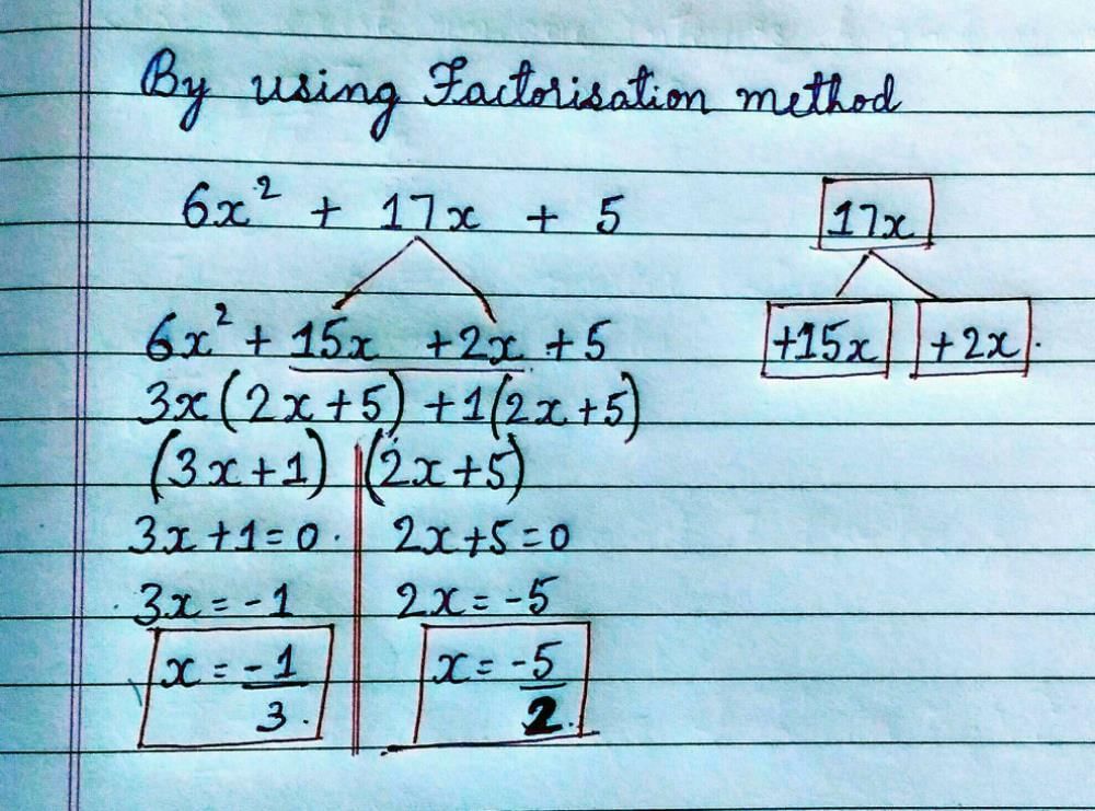 Here you can find the meaning of Factorise 6x² + 17x + 5 using factor theorem.? defined & explained in the simplest way possible. Besides giving the explanation of Factorise 6x² + 17x + 5 using factor theorem.?, a detailed solution for Factorise 6x² + 17x + 5 using factor theorem.? has been provided alongside types of Factorise 6x² + 17x + 5 using factor theorem.? theory, EduRev gives you an ample number of questions to practice Factorise 6x² + 17x + 5 using factor theorem.? tests, examples and also practice Class 10 tests.