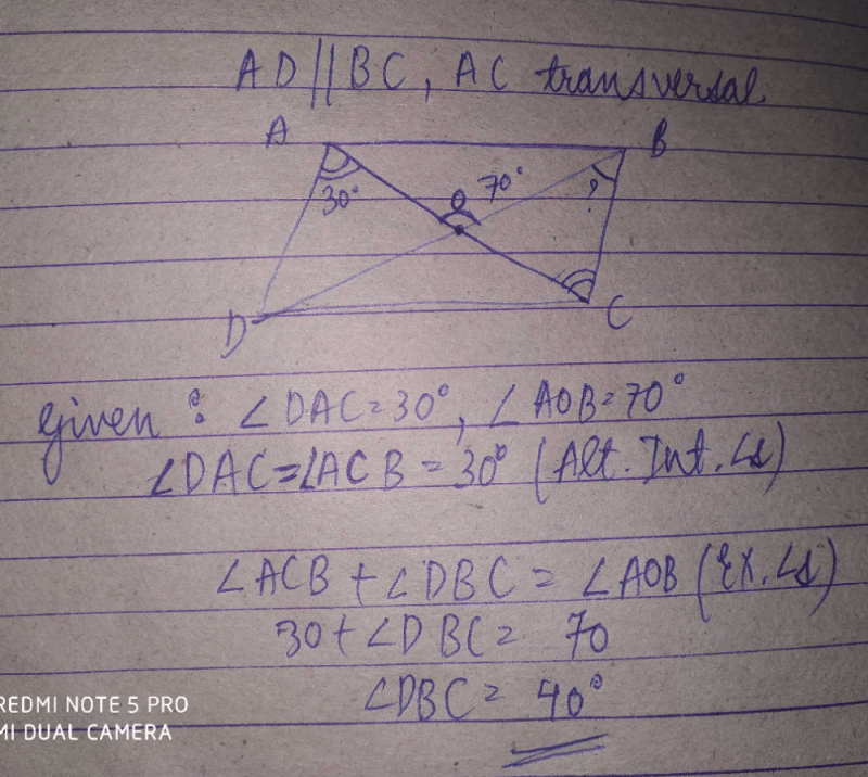 Here you can find the meaning of The Diagonals AC and BD of a Parallelogram ABCD intersect each other at the point O such that∠DAC = 30 and∠AOB = 70. Then, ∠DBC?a)30b)45c)35d)40Correct answer is option 'D'. Can you explain this answer? defined & explained in the simplest way possible. Besides giving the explanation of The Diagonals AC and BD of a Parallelogram ABCD intersect each other at the point O such that∠DAC = 30 and∠AOB = 70. Then, ∠DBC?a)30b)45c)35d)40Correct answer is option 'D'. Can you explain this answer?, a detailed solution for The Diagonals AC and BD of a Parallelogram ABCD intersect each other at the point O such that∠DAC = 30 and∠AOB = 70. Then, ∠DBC?a)30b)45c)35d)40Correct answer is option 'D'. Can you explain this answer? has been provided alongside types of The Diagonals AC and BD of a Parallelogram ABCD intersect each other at the point O such that∠DAC = 30 and∠AOB = 70. Then, ∠DBC?a)30b)45c)35d)40Correct answer is option 'D'. Can you explain this answer? theory, EduRev gives you an ample number of questions to practice The Diagonals AC and BD of a Parallelogram ABCD intersect each other at the point O such that∠DAC = 30 and∠AOB = 70. Then, ∠DBC?a)30b)45c)35d)40Correct answer is option 'D'. Can you explain this answer? tests, examples and also practice Class 9 tests.