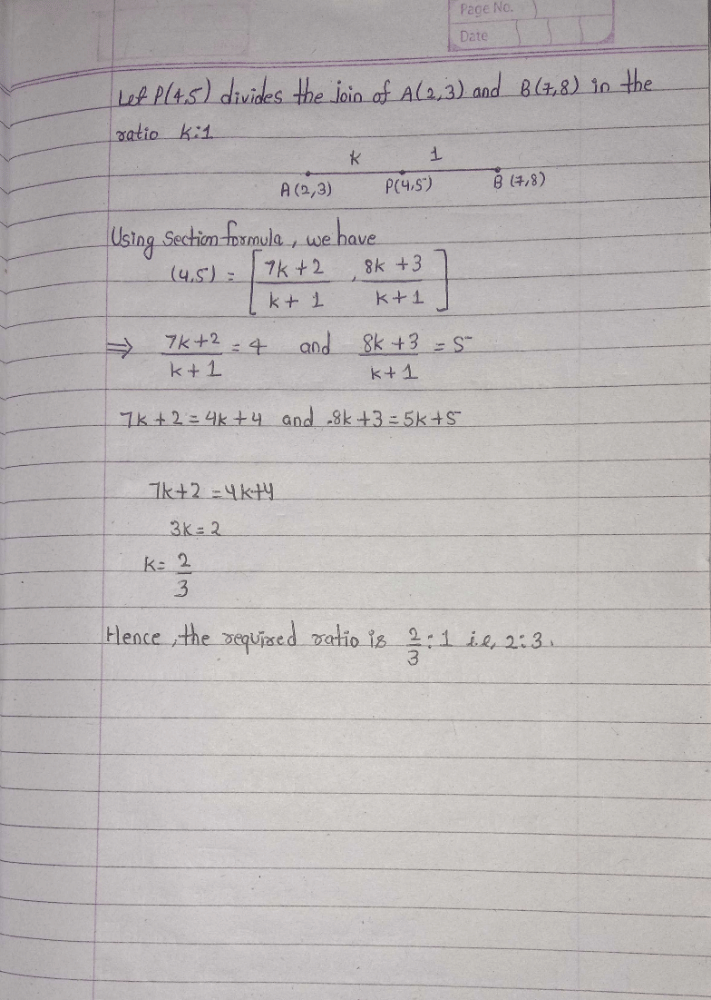 Here you can find the meaning of The ratio in which (4,5) divides the line segment joining the points (2,3) and (7,8) isa)2:3b)-3:2c)3:2d)-2:3Correct answer is option 'A'. Can you explain this answer? defined & explained in the simplest way possible. Besides giving the explanation of The ratio in which (4,5) divides the line segment joining the points (2,3) and (7,8) isa)2:3b)-3:2c)3:2d)-2:3Correct answer is option 'A'. Can you explain this answer?, a detailed solution for The ratio in which (4,5) divides the line segment joining the points (2,3) and (7,8) isa)2:3b)-3:2c)3:2d)-2:3Correct answer is option 'A'. Can you explain this answer? has been provided alongside types of The ratio in which (4,5) divides the line segment joining the points (2,3) and (7,8) isa)2:3b)-3:2c)3:2d)-2:3Correct answer is option 'A'. Can you explain this answer? theory, EduRev gives you an ample number of questions to practice The ratio in which (4,5) divides the line segment joining the points (2,3) and (7,8) isa)2:3b)-3:2c)3:2d)-2:3Correct answer is option 'A'. Can you explain this answer? tests, examples and also practice Class 10 tests.