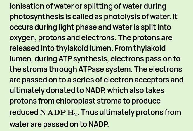 Ionisation of water or splitting of water during photosynthesis is called as photolysis of water. It occurs during light phase and water is split into oxygen, protons and electrons. The protons are released into thylakoid lumen. From thylakoid lumen, during ATP synthesis, electrons pass on to the stroma through ATPase system. The electrons are passed on to a series of electron acceptors and ultimately donated to NADP, which also takes protons from chloroplast stroma to produce reduced NADPH2. Thus ultimately protons from water are passed on to NADP.