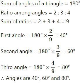 ample number of questions to practice The angles of a triangle are in the ratio 2:3:4.So, the degree measures of the angles area)20, 30, 40b)40, 60, 80c)80, 20, 80d)10, 15, 20Correct answer is option 'B'. Can you explain this answer? tests, examples and also practice Class 9 tests.