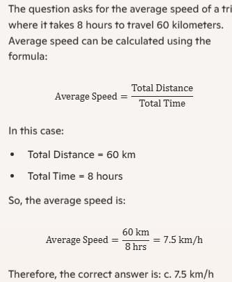 During traffic,it takes 8hrs to travel 60km. What is the average speed in km/h in this trip? a. 5.5km/h b. 6.6km/h c. 7.5km/h d. 8.5km/h SOLUTION:? for Class 7 2025 is part of Class 7 preparation. The Question and answers have been prepared