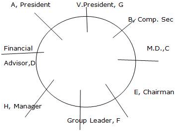 Study the following information carefully and answer the given questions.Eight colleagues, A, B, C, D, E, F, G and H are sitting around a circular table facing the center but not necessarily in the same order. Each one of the them holds a different post viz. Manager, Company Secretary, Chairman, President, Vice-president, Group Leader, Financial Advisor and Managing Director.A sits third to right of the managing director. Only two people sit between the managing director and H. Vice-president and the company secretary are immediate neighbors of each other. Neither A nor H is a vice-president or a company secretary. Vice-president is not an immediate neighbor of the managing director. Manager sits second to the left of E. E is not an immediate neighbor of H. The Manager is an immediate neighbor of both group leader and the financial advisor. Financial advisor sits third to right of B. B is not the vice-president. C sits to the immediate right of the chairman. A is not the chairman. F is not an immediate neighbor of A. G is not an immediate neighbor of the Manager.Q. Which of the following is true with respect to the given seating arrangement?a)The group leader of the company is an immediate neighbor of the vice-presidentb)G sits second to right of Dc)The group leader and the company secretary are immediate neighbors of each other.d)the chairman of the company sits to the immediate left of the managing directore)the group leader sits second to the left of DCorrect answer is option 'D'. Can you explain this answer?, a detailed solution for Study the following information carefully and answer the given questions.Eight colleagues, A, B, C, D, E, F, G and H are sitting around a circular table facing the center but not necessarily in the same order. Each one of the them holds a different post viz. Manager, Company Secretary, Chairman, President, Vice-president, Group Leader, Financial Advisor and Managing Director.A sits third to right of the managing director. Only two people sit between the managing director and H. Vice-president and the company secretary are immediate neighbors of each other. Neither A nor H is a vice-president or a company secretary. Vice-president is not an immediate neighbor of the managing director. Manager sits second to the left of E. E is not an immediate neighbor of H. The Manager is an immediate neighbor of both group leader and the financial advisor. Financial advisor sits third to right of B. B is not the vice-president. C sits to the immediate right of the chairman. A is not the chairman. F is not an immediate neighbor of A. G is not an immediate neighbor of the Manager.Q. Which of the following is true with respect to the given seating arrangement?a)The group leader of the company is an immediate neighbor of the vice-presidentb)G sits second to right of Dc)The group leader and the company secretary are immediate neighbors of each other.d)the chairman of the company sits to the immediate left of the managing directore)the group leader sits second to the left of DCorrect answer is option 'D'. Can you explain this answer? has been provided alongside types of Study the following information carefully and answer the given questions.Eight colleagues, A, B, C, D, E, F, G and H are sitting around a circular table facing the center but not necessarily in the same order. Each one of the them holds a different post viz. Manager, Company Secretary, Chairman, President, Vice-president, Group Leader, Financial Advisor and Managing Director.A sits third to right of the managing director. Only two people sit between the managing director and H. Vice-president and the company secretary are immediate neighbors of each other. Neither A nor H is a vice-president or a company secretary. Vice-president is not an immediate neighbor of the managing director. Manager sits second to the left of E. E is not an immediate neighbor of H. The Manager is an immediate neighbor of both group leader and the financial advisor. Financial advisor sits third to right of B. B is not the vice-president. C sits to the immediate right of the chairman. A is not the chairman. F is not an immediate neighbor of A. G is not an immediate neighbor of the Manager.Q. Which of the following is true with respect to the given seating arrangement?a)The group leader of the company is an immediate neighbor of the vice-presidentb)G sits second to right of Dc)The group leader and the company secretary are immediate neighbors of each other.d)the chairman of the company sits to the immediate left of the managing directore)the group leader sits second to the left of DCorrect answer is option 'D'. Can you explain this answer? theory, EduRev gives you an