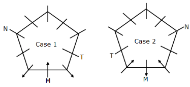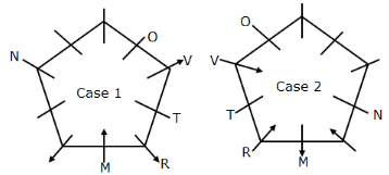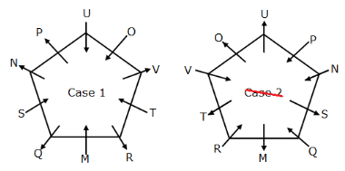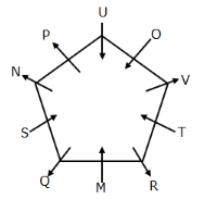Ten persons M, N, O, P, Q, R, S, T, U and V are sitting around a pentagonal table in such a way that five persons are sitting at the corners whereas five persons are sitting in the middle of the sides of the table. Some of them are facing towards the centre and the remaining facing away from the centre. More than two persons facing the same direction don’t sit adjacent together.