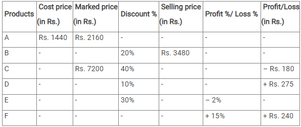 Direction: The given table shows the different prices of six products sold by a store and the profit/loss in their sales, but some of the details is missing from the table. Study the table and answer the question that follow.Note: A positive (+) sign denotes profit, while a negative (–) sign denotes loss.Q. If a successive discount of 10% is given on the product A, then the profit earned by the store decreases by Rs. 162. What was the initial discount offered by the store on product A?a)10%b)15%c)20%d)25%e)30%Correct answer is option 'D'. Can you explain this answer?, a detailed solution for Direction: The given table shows the different prices of six products sold by a store and the profit/loss in their sales, but some of the details is missing from the table. Study the table and answer the question that follow.Note: A positive (+) sign denotes profit, while a negative (–) sign denotes loss.Q. If a successive discount of 10% is given on the product A, then the profit earned by the store decreases by Rs. 162. What was the initial discount offered by the store on product A?a)10%b)15%c)20%d)25%e)30%Correct answer is option 'D'. Can you explain this answer? has been provided alongside types of Direction: The given table shows the different prices of six products sold by a store and the profit/loss in their sales, but some of the details is missing from the table. Study the table and answer the question that follow.Note: A positive (+) sign denotes profit, while a negative (–) sign denotes loss.Q. If a successive discount of 10% is given on the product A, then the profit earned by the store decreases by Rs. 162. What was the initial discount offered by the store on product A?a)10%b)15%c)20%d)25%e)30%Correct answer is option 'D'. Can you explain this answer? theory, EduRev gives you an