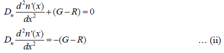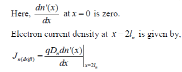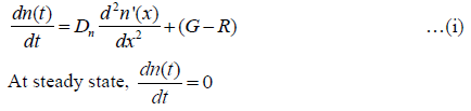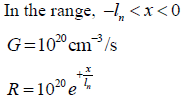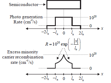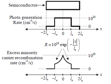 A p-type semiconductor with zero electric field is under illumination (low level injection) in steady state condition. Excess minority carrier density is zero at x = ±2ln , where ln = 10-4 cm is the diffusion length of electrons. Assume electronic charge, q = -1.6 x 10-19C . The profiles of photo-generation rate of carriers and the recombination rate of excess minority carriers (?) are shown. Under these conditions, the magnitude of the current density due to the photo-generated electrons at x = +2In is _________ mA/cm2(round off to two decimal places).a)0.57b)0.61Correct answer is between '0.57,0.61'. Can you explain this answer?, a detailed solution for A p-type semiconductor with zero electric field is under illumination (low level injection) in steady state condition. Excess minority carrier density is zero at x = ±2ln , where ln = 10-4 cm is the diffusion length of electrons. Assume electronic charge, q = -1.6 x 10-19C . The profiles of photo-generation rate of carriers and the recombination rate of excess minority carriers (?) are shown. Under these conditions, the magnitude of the current density due to the photo-generated electrons at x = +2In is _________ mA/cm2(round off to two decimal places).a)0.57b)0.61Correct answer is between '0.57,0.61'. Can you explain this answer? has been provided alongside types of A p-type semiconductor with zero electric field is under illumination (low level injection) in steady state condition. Excess minority carrier density is zero at x = ±2ln , where ln = 10-4 cm is the diffusion length of electrons. Assume electronic charge, q = -1.6 x 10-19C . The profiles of photo-generation rate of carriers and the recombination rate of excess minority carriers (?) are shown. Under these conditions, the magnitude of the current density due to the photo-generated electrons at x = +2In is _________ mA/cm2(round off to two decimal places).a)0.57b)0.61Correct answer is between '0.57,0.61'. Can you explain this answer? theory, EduRev gives you an