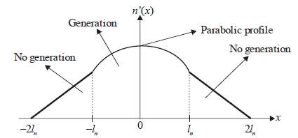 Find important definitions, questions, meanings, examples, exercises and tests below for A p-type semiconductor with zero electric field is under illumination (low level injection) in steady state condition. Excess minority carrier density is zero at x = ±2ln , where ln = 10-4 cm is the diffusion length of electrons. Assume electronic charge, q = -1.6 x 10-19C . The profiles of photo-generation rate of carriers and the recombination rate of excess minority carriers (?) are shown. Under these conditions, the magnitude of the current density due to the photo-generated electrons at x = +2In is _________ mA/cm2(round off to two decimal places).a)0.57b)0.61Correct answer is between '0.57,0.61'. Can you explain this answer?.