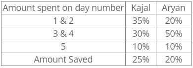 Directions: Study the following information carefully and answer the questions given beside.Kajal and Aryan went on a five-day vacation with a certain amount of money with both of them. They spent a certain amount of money in these five days and saved the rest.In the first two days, Kajal spent 16.67% more amount than Aryan and in the five days, Aryan spent 50% more amount than Kajal. Aryan saved 20% of his money while Kajal saved 25% of her money. Both of them spent 10% of their money on the fifth day. In the first four days, Aryan spent $320 more than Kajal. On the third and fourth day combined, Kajal spent 30% of her total money while Aryan spent half of his money. Kajal spent $120 on the second day while Aryan spent only $48 that day.Q.The money spent by Aryan on the second day is what percent of the money spent by Kajal on the fifth day?a)60%b)50%c)62.5%d)45%Correct answer is option 'A'. Can you explain this answer?, a detailed solution for Directions: Study the following information carefully and answer the questions given beside.Kajal and Aryan went on a five-day vacation with a certain amount of money with both of them. They spent a certain amount of money in these five days and saved the rest.In the first two days, Kajal spent 16.67% more amount than Aryan and in the five days, Aryan spent 50% more amount than Kajal. Aryan saved 20% of his money while Kajal saved 25% of her money. Both of them spent 10% of their money on the fifth day. In the first four days, Aryan spent $320 more than Kajal. On the third and fourth day combined, Kajal spent 30% of her total money while Aryan spent half of his money. Kajal spent $120 on the second day while Aryan spent only $48 that day.Q.The money spent by Aryan on the second day is what percent of the money spent by Kajal on the fifth day?a)60%b)50%c)62.5%d)45%Correct answer is option 'A'. Can you explain this answer? has been provided alongside types of Directions: Study the following information carefully and answer the questions given beside.Kajal and Aryan went on a five-day vacation with a certain amount of money with both of them. They spent a certain amount of money in these five days and saved the rest.In the first two days, Kajal spent 16.67% more amount than Aryan and in the five days, Aryan spent 50% more amount than Kajal. Aryan saved 20% of his money while Kajal saved 25% of her money. Both of them spent 10% of their money on the fifth day. In the first four days, Aryan spent $320 more than Kajal. On the third and fourth day combined, Kajal spent 30% of her total money while Aryan spent half of his money. Kajal spent $120 on the second day while Aryan spent only $48 that day.Q.The money spent by Aryan on the second day is what percent of the money spent by Kajal on the fifth day?a)60%b)50%c)62.5%d)45%Correct answer is option 'A'. Can you explain this answer? theory, EduRev gives you an