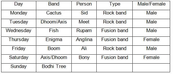 Here you can find the meaning of Directions: The following question is based on the given set of conditions. Choose the response that most accurately and completely answers the question.Seven bands were scheduled to perform during a week-long music festival at XLRI. The festival began on a Monday evening and ended on the Sunday evening. Each day, only one band performed. Each band performed only once. The organising committee had the task of scheduling the performances of the seven bands - Cactus, Axis, Enigma, Boom, Fish, Dhoom and Bodhi Tree. The festival schedule followed the following conditions:The performance of Bodhi Tree, the home band of XLRI, did not precede the performance of any other band. Among the visiting bands, three were rock bands and the other three were fusion bands. All three bands of the same genre were not allowed to perform consecutively. Boom, which was a rock band, refused to perform immediately before or after Fish. Meet, who was a lead vocalist with a rock band, refused to perform after Angelina. Angelina, the only female lead vocalist in the music fest besides Bony, was with the band Enigma. Angelina refused to perform after Thursday citing personal reasons. Ali, who was the lead vocalist of a rock band, was not with the band Dhoom, and did not perform on Saturday. Sid, the lead vocalist of the rock band Cactus, could perform only on Monday. Rupam, the only male among the lead vocalists of the fusion bands, was with Fish and performed on Wednesday. None of the bands performed in absence of their lead vocalist.Q.How many times from Monday to Saturday did the fusion band and rock band perform consecutively?Correct answer is '3'. Can you explain this answer? defined & explained in the simplest way possible. Besides giving the explanation of Directions: The following question is based on the given set of conditions. Choose the response that most accurately and completely answers the question.Seven bands were scheduled to perform during a week-long music festival at XLRI. The festival began on a Monday evening and ended on the Sunday evening. Each day, only one band performed. Each band performed only once. The organising committee had the task of scheduling the performances of the seven bands - Cactus, Axis, Enigma, Boom, Fish, Dhoom and Bodhi Tree. The festival schedule followed the following conditions:The performance of Bodhi Tree, the home band of XLRI, did not precede the performance of any other band. Among the visiting bands, three were rock bands and the other three were fusion bands. All three bands of the same genre were not allowed to perform consecutively. Boom, which was a rock band, refused to perform immediately before or after Fish. Meet, who was a lead vocalist with a rock band, refused to perform after Angelina. Angelina, the only female lead vocalist in the music fest besides Bony, was with the band Enigma. Angelina refused to perform after Thursday citing personal reasons. Ali, who was the lead vocalist of a rock band, was not with the band Dhoom, and did not perform on Saturday. Sid, the lead vocalist of the rock band Cactus, could perform only on Monday. Rupam, the only male among the lead vocalists of the fusion bands, was with Fish and performed on Wednesday. None of the bands performed in absence of their lead vocalist.Q.How many times from Monday to Saturday did the fusion band and rock band perform consecutively?Correct answer is '3'. Can you explain this answer?, a detailed solution for Directions: The following question is based on the given set of conditions. Choose the response that most accurately and completely answers the question.Seven bands were scheduled to perform during a week-long music festival at XLRI. The festival began on a Monday evening and ended on the Sunday evening. Each day, only one band performed. Each band performed only once. The organising committee had the task of scheduling the performances of the seven bands - Cactus, Axis, Enigma, Boom, Fish, Dhoom and Bodhi Tree. The festival schedule followed the following conditions:The performance of Bodhi Tree, the home band of XLRI, did not precede the performance of any other band. Among the visiting bands, three were rock bands and the other three were fusion bands. All three bands of the same genre were not allowed to perform consecutively. Boom, which was a rock band, refused to perform immediately before or after Fish. Meet, who was a lead vocalist with a rock band, refused to perform after Angelina. Angelina, the only female lead vocalist in the music fest besides Bony, was with the band Enigma. Angelina refused to perform after Thursday citing personal reasons. Ali, who was the lead vocalist of a rock band, was not with the band Dhoom, and did not perform on Saturday. Sid, the lead vocalist of the rock band Cactus, could perform only on Monday. Rupam, the only male among the lead vocalists of the fusion bands, was with Fish and performed on Wednesday. None of the bands performed in absence of their lead vocalist.Q.How many times from Monday to Saturday did the fusion band and rock band perform consecutively?Correct answer is '3'. Can you explain this answer? has been provided alongside types of Directions: The following question is based on the given set of conditions. Choose the response that most accurately and completely answers the question.Seven bands were scheduled to perform during a week-long music festival at XLRI. The festival began on a Monday evening and ended on the Sunday evening. Each day, only one band performed. Each band performed only once. The organising committee had the task of scheduling the performances of the seven bands - Cactus, Axis, Enigma, Boom, Fish, Dhoom and Bodhi Tree. The festival schedule followed the following conditions:The performance of Bodhi Tree, the home band of XLRI, did not precede the performance of any other band. Among the visiting bands, three were rock bands and the other three were fusion bands. All three ba