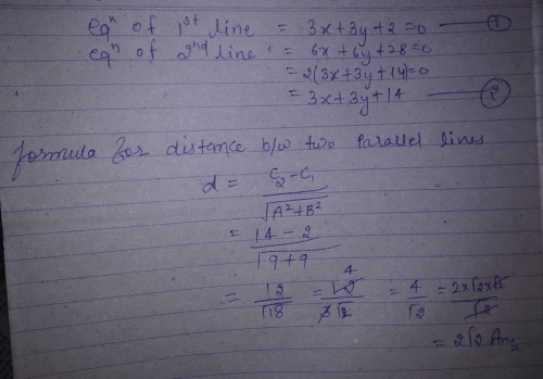 Solutions for Can you explain the answer of this question below:What is the distance between the parallel lines 3(x+y) + 2 = 0 And 6x+6y+28 = 0 ?A:2√2B:4C:2D:3√2The answer is a. in English & in Hindi are available as part of our courses for JEE. Download more important topics, notes, lectures and mock test series for JEE Exam by signing up for free.
