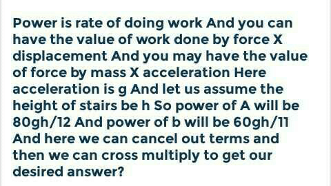 A man A of mass 80 kg runs up a staircase in 12 seconds. Another man of mass 60 kg runs up the same staircase in 11 seconds. The ratio of powers of A and B is :