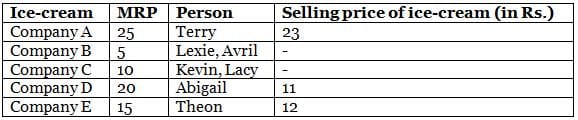 Directions: Read the given information carefully and answer the question that follows.Mr. Webster has an ice-cream shop, where he sells ice creams of different companies (Company A, Company B, Company C, Company D and Company E). The maximum price at which he can sell an ice-cream is called MRP (Maximum Retail Price). The MRP for each of the five ice-cream service companies is a distinct value, such as Rs. 5, Rs. 10, Rs. 15, Rs. 20 and Rs. 25, not necessarily in that order. On a particular day, Mr. Webster sold exactly seven ice-creams, each to a different customer. The customers were Abigail, Avril, Kevin, Lacy, Lexie, Terry and Theon.The following information is known about the ice-creams that he sold.(1) He sold at least one ice-cream from each ice-cream company.(2) The MRP of ice-cream of Company A is greater than Rs. 15, but he did not sell ice-cream of Company A to Avril.(3) He sold two ice-creams, one to Kevin and one to Lacy, of the same ice-cream company of MRP Rs. 10.(4) He sold Company D ice-cream to Abigail for Rs. 11 and the maximum selling price of any ice-cream that he sold to any of the seven customers was Rs. 23.(5) He sold the ice-cream with MRP of Rs. 15 only to Theon.(6) He sold two ice-creams of Company B, one of which was to Lexie and sold ice-cream of Company E for Rs. 12.Q.What is the MRP(in Rs.) of Company Es ice-cream?Correct answer is '15'. Can you explain this answer? for CAT 2026 is part of CAT preparation. The Question and answers have been prepared according to the CAT exam syllabus. Information about Directions: Read the given information carefully and answer the question that follows.Mr. Webster has an ice-cream shop, where he sells ice creams of different companies (Company A, Company B, Company C, Company D and Company E). The maximum price at which he can sell an ice-cream is called MRP (Maximum Retail Price). The MRP for each of the five ice-cream service companies is a distinct value, such as Rs. 5, Rs. 10, Rs. 15, Rs. 20 and Rs. 25, not necessarily in that order. On a particular day, Mr. Webster sold exactly seven ice-creams, each to a different customer. The customers were Abigail, Avril, Kevin, Lacy, Lexie, Terry and Theon.The following information is known about the ice-creams that he sold.(1) He sold at least one ice-cream from each ice-cream company.(2) The MRP of ice-cream of Company A is greater than Rs. 15, but he did not sell ice-cream of Company A to Avril.(3) He sold two ice-creams, one to Kevin and one to Lacy, of the same ice-cream company of MRP Rs. 10.(4) He sold Company D ice-cream to Abigail for Rs. 11 and the maximum selling price of any ice-cream that he sold to any of the seven customers was Rs. 23.(5) He sold the ice-cream with MRP of Rs. 15 only to Theon.(6) He sold two ice-creams of Company B, one of which was to Lexie and sold ice-cream of Company E for Rs. 12.Q.What is the MRP(in Rs.) of Company Es ice-cream?Correct answer is '15'. Can you explain this answer? covers all topics & solutions for CAT 2026 Exam. Find important definitions, questions, meanings, examples, exercises and tests below for Directions: Read the given information carefully and answer the question that follows.Mr. Webster has an ice-cream shop, where he sells ice creams of different companies (Company A, Company B, Company C, Company D and Company E). The maximum price at which he can sell an ice-cream is called MRP (Maximum Retail Price). The MRP for each of the five ice-cream service companies is a distinct value, such as Rs. 5, Rs. 10, Rs. 15, Rs. 20 and Rs. 25, not necessarily in that order. On a particular day, Mr. Webster sold exactly seven ice-creams, each to a different customer. The customers were Abigail, Avril, Kevin, Lacy, Lexie, Terry and Theon.The following information is known about the ice-creams that he sold.(1) He sold at least one ice-cream from each ice-cream company.(2) The MRP of ice-cream of Company A is greater than Rs. 15, but he did not sell ice-cream of Company A to Avril.(3) He sold two ice-creams, one to Kevin and one to Lacy, of the same ice-cream company of MRP Rs. 10.(4) He sold Company D ice-cream to Abigail for Rs. 11 and the maximum selling price of any ice-cream that he sold to any of the seven customers was Rs. 23.(5) He sold the ice-cream with MRP of Rs. 15 only to Theon.(6) He sold two ice-creams of Company B, one of which was to Lexie and sold ice-cream of Company E for Rs. 12.Q.What is the MRP(in Rs.) of Company Es ice-cream?Correct answer is '15'. Can you explain this answer?.