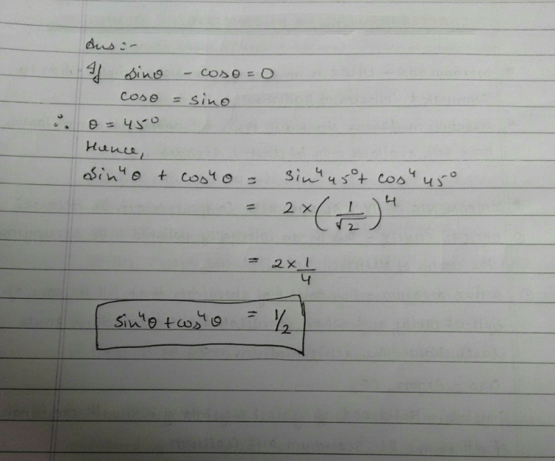 Find important definitions, questions, meanings, examples, exercises and tests below for Ifsinθ−cosθ=0, then the value ofsin4θ + cos4θ isa)√2b)1/4c)1/3d)1/2Correct answer is option 'D'. Can you explain this answer?.