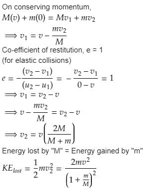 A large mass M moving with velocity v makes an elastic head-on collision with a small mass m at rest. What will be the expression for energy lost by mass M?
