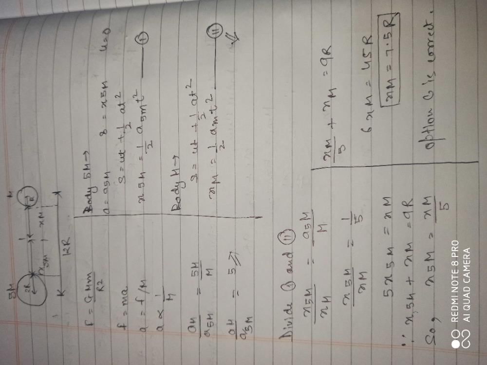5. Let v be the velocity of A at any instant. Then, by kinematics, v^2 = 2ad = 2G(5M)/(d^2) * 12R.