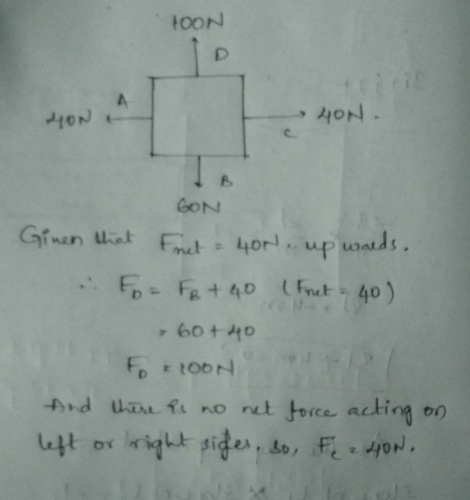 Find important definitions, questions, meanings, examples, exercises and tests below for Free body diagram of a situation is shown below. The net force is known, however, the magnitude of few of the forces is not known. The magnitude of the unknown forces C and D will be:a)C = 40 N, D = 80 Nb)C = 40 N, D = 100 Nc)C = 40 N, D = 80 Nd)C = 40 N, D = 60 NCorrect answer is option 'B'. Can you explain this answer?.
