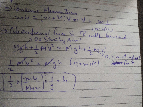 A bullet of mass m fired from gun with velocity u m/s penetrates in a bag of mass M which is suspended from a rigid support. Calculate height attain by bag after penetration? [Ans.- (mu)×(mu)/2g(M+m)×(M+m)?