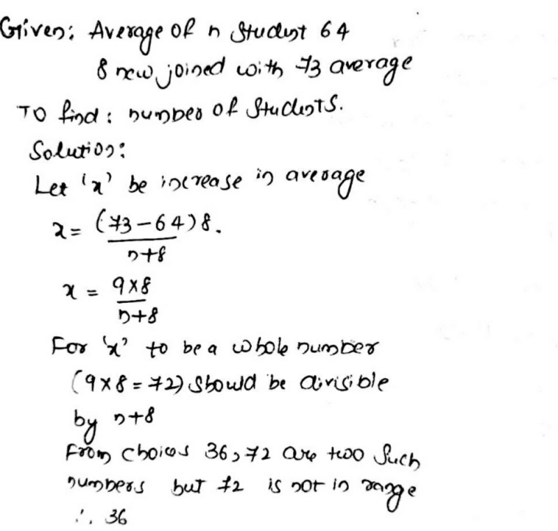 ample number of questions to practice The average mark of a class of n students is 64. When eight new students with an average mark of 73 join the class, the new average of the entire class is a whole number. Find the number of students now in the class, given that n lies between 25 and 60.a)44b)32c)36d)72Correct answer is option 'C'. Can you explain this answer? tests, examples and also practice Quant tests.
