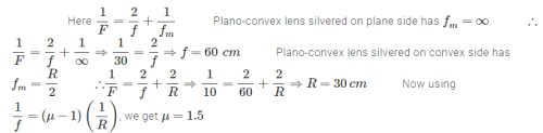 A plano-convex lens, when silvered on the plane side, behaves like a concave mirror of focal length 30 cm. When it is silvered on the convex side, it behaves like a concave mirror of focal length 10 cm. The refractive index of the material of the lens isa)2.0b)2.5c)1.5d)3.0Correct answer is option 'C'. Can you explain this answer?, a detailed solution for A plano-convex lens, when silvered on the plane side, behaves like a concave mirror of focal length 30 cm. When it is silvered on the convex side, it behaves like a concave mirror of focal length 10 cm. The refractive index of the material of the lens isa)2.0b)2.5c)1.5d)3.0Correct answer is option 'C'. Can you explain this answer? has been provided alongside types of A plano-convex lens, when silvered on the plane side, behaves like a concave mirror of focal length 30 cm. When it is silvered on the convex side, it behaves like a concave mirror of focal length 10 cm. The refractive index of the material of the lens isa)2.0b)2.5c)1.5d)3.0Correct answer is option 'C'. Can you explain this answer? theory, EduRev gives you an