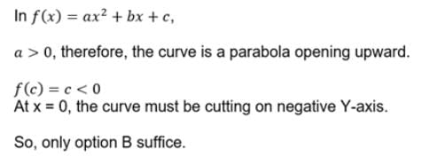 Find important definitions, questions, meanings, examples, exercises and tests below for Which of the following graph represents expression f(x) = ax2+ bx + c (a ¹ 0) when a > 0, b < 0 & c < 0 ?a)b)c)d)Correct answer is option 'B'. Can you explain this answer?.