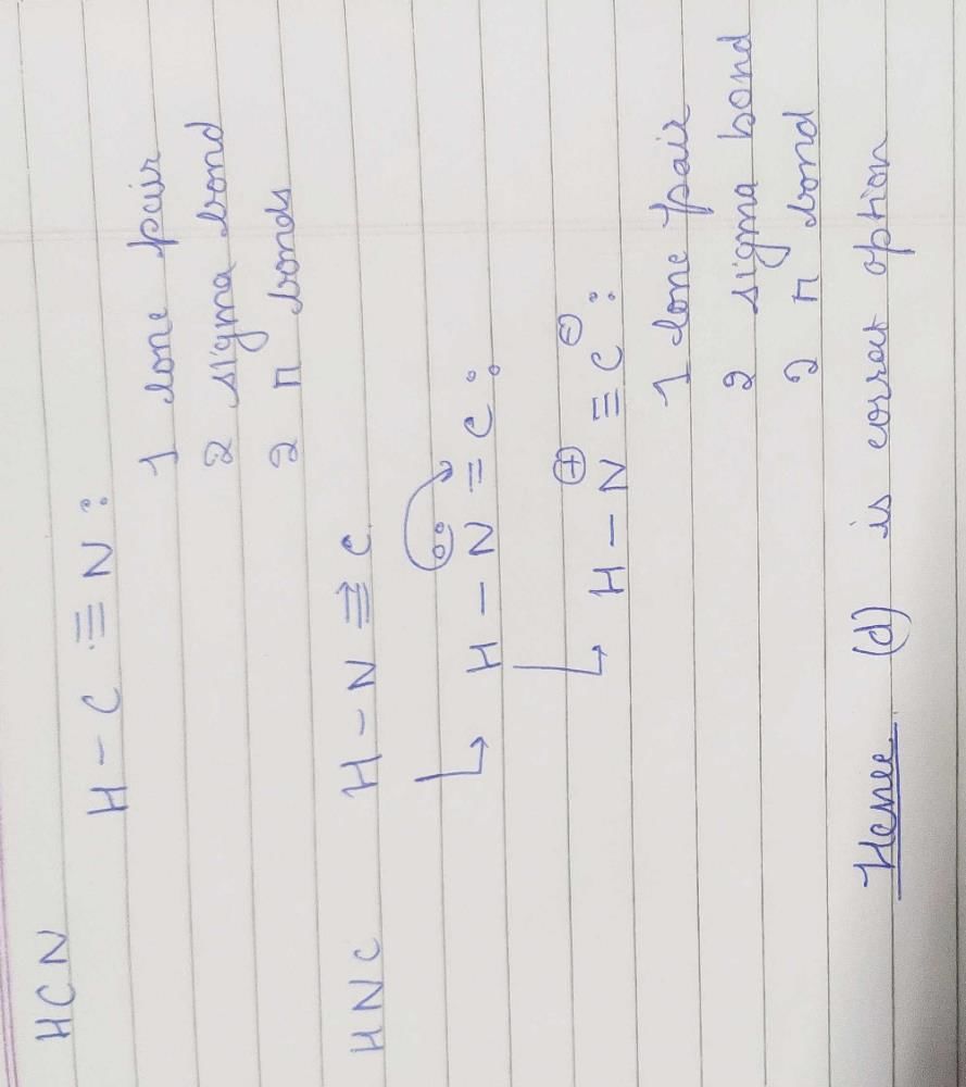 HCN and HNC molecules have equal number ofa)lone pairs and σ-bondsb)o-bonds and π-bondsc)π-bonds and lone paird)lone pairs, σ-bonds and π-bondsCorrect answer is option 'D'. Can you explain this answer?, a detailed solution for HCN and HNC molecules have equal number ofa)lone pairs and σ-bondsb)o-bonds and π-bondsc)π-bonds and lone paird)lone pairs, σ-bonds and π-bondsCorrect answer is option 'D'. Can you explain this answer? has been provided alongside types of HCN and HNC molecules have equal number ofa)lone pairs and σ-bondsb)o-bonds and π-bondsc)π-bonds and lone paird)lone pairs, σ-bonds and π-bondsCorrect answer is option 'D'. Can you explain this answer? theory, EduRev gives you an