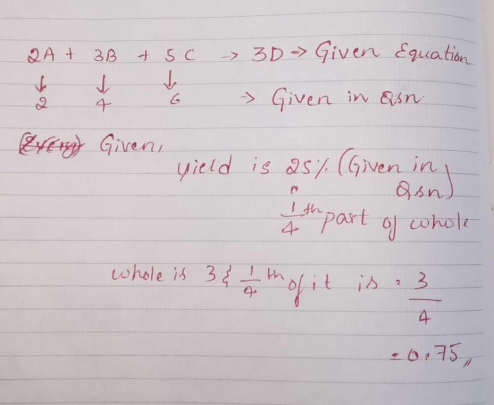For the reaction 2A + 3B + 5C →3DInitially if 2 mole of A, 4 mole of B and 6 mole of C is taken, With 25% yield, moles of D which can be produced are _____________.a)0.75b)0.5c)0.25d)0.6Correct answer is option 'A'. Can you explain this answer?, a detailed solution for For the reaction 2A + 3B + 5C →3DInitially if 2 mole of A, 4 mole of B and 6 mole of C is taken, With 25% yield, moles of D which can be produced are _____________.a)0.75b)0.5c)0.25d)0.6Correct answer is option 'A'. Can you explain this answer? has been provided alongside types of For the reaction 2A + 3B + 5C →3DInitially if 2 mole of A, 4 mole of B and 6 mole of C is taken, With 25% yield, moles of D which can be produced are _____________.a)0.75b)0.5c)0.25d)0.6Correct answer is option 'A'. Can you explain this answer? theory, EduRev gives you an