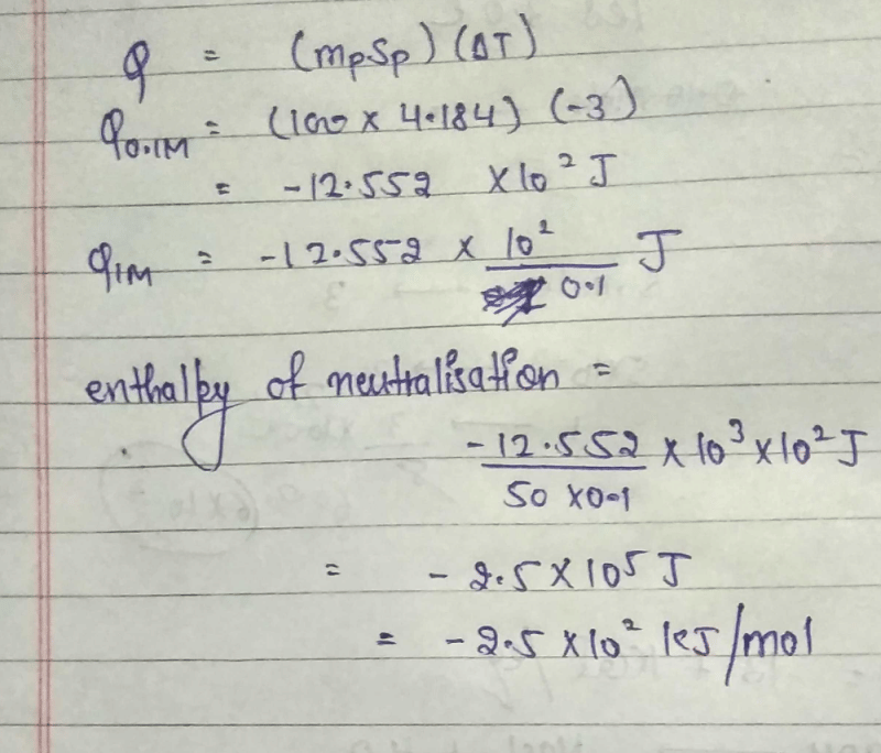 50.0 mL of 0.10 M HCl is mixed with 50.0 mL of 0.10 M NaOH. The solution temperature rises by 3.0°C Calculate the enthalpy of neutralization per mole of HCl. [take proper assumptions]