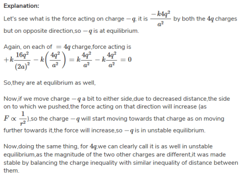 Point charges + 4q, –q and +4q are kept on theX-axis at points x = 0, x =a and x = 2a respectively.a)only – q is in stable equilibrium [1988]b)none of the charges is in equilibriumc)all the charges are in unstable equilibriumd)all the charges are in stable equilibrium.Correct answer is option 'C'. Can you explain this answer? for Class 12 2026 is part of Class 12 preparation. The Question and answers have been prepared according to the Class 12 exam syllabus. Information about Point charges + 4q, –q and +4q are kept on theX-axis at points x = 0, x =a and x = 2a respectively.a)only – q is in stable equilibrium [1988]b)none of the charges is in equilibriumc)all the charges are in unstable equilibriumd)all the charges are in stable equilibrium.Correct answer is option 'C'. Can you explain this answer? covers all topics & solutions for Class 12 2026 Exam. Find important definitions, questions, meanings, examples, exercises and tests below for Point charges + 4q, –q and +4q are kept on theX-axis at points x = 0, x =a and x = 2a respectively.a)only – q is in stable equilibrium [1988]b)none of the charges is in equilibriumc)all the charges are in unstable equilibriumd)all the charges are in stable equilibrium.Correct answer is option 'C'. Can you explain this answer?.