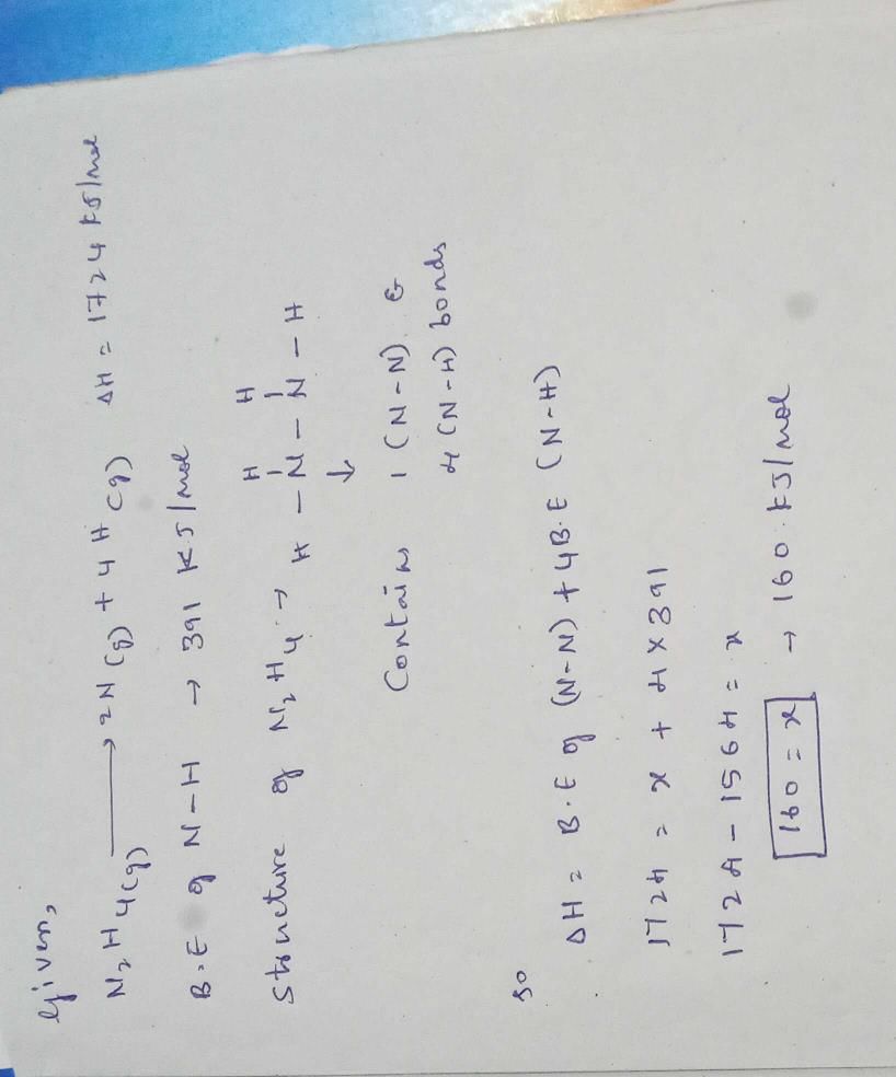so the bond energy of N - N in N2H4 = 1724 - 1564 = 160 KJ / mol
