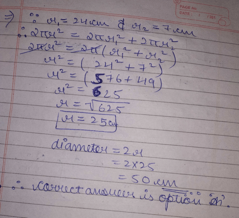 Here you can find the meaning of The diameter of a circle whose area is equal to the sum of the areas of the two circles of radii 24 cm and 7 cm is​a)50 cmb)31 cmc)62 cmd)25 cmCorrect answer is option 'A'. Can you explain this answer? defined & explained in the simplest way possible. Besides giving the explanation of The diameter of a circle whose area is equal to the sum of the areas of the two circles of radii 24 cm and 7 cm is​a)50 cmb)31 cmc)62 cmd)25 cmCorrect answer is option 'A'. Can you explain this answer?, a detailed solution for The diameter of a circle whose area is equal to the sum of the areas of the two circles of radii 24 cm and 7 cm is​a)50 cmb)31 cmc)62 cmd)25 cmCorrect answer is option 'A'. Can you explain this answer? has been provided alongside types of The diameter of a circle whose area is equal to the sum of the areas of the two circles of radii 24 cm and 7 cm is​a)50 cmb)31 cmc)62 cmd)25 cmCorrect answer is option 'A'. Can you explain this answer? theory, EduRev gives you an ample number of questions to practice The diameter of a circle whose area is equal to the sum of the areas of the two circles of radii 24 cm and 7 cm is​a)50 cmb)31 cmc)62 cmd)25 cmCorrect answer is option 'A'. Can you explain this answer? tests, examples and also practice Class 10 tests.