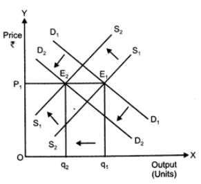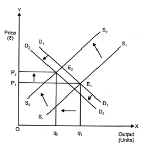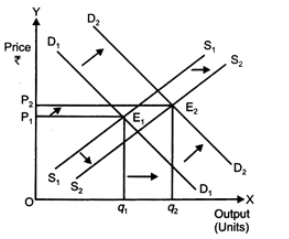 Let S1S1 and D1D1 be the initial supply curve and the initial demand curve respectively. The initial equilibrium is at point E1, with equilibrium price at oP1 and equilibrium output oq1.