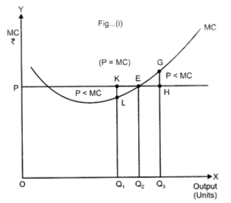 If price is greater than the MC the firm can increase profit by increasing the production. In figure (i) At output OQ1, price is KQ1 and the marginal cost is LQ1, such that KQ1 >LQ1. Therefore, OQ1 is not the profit maximizing output. This is due to the fact that the firm can increase its profit by increasing the production of output to OQ2
