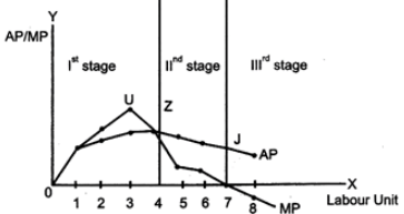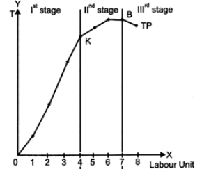 II | Diminishing Returns to a factor | Increases at a decreasing rate and attains maximum | From K to point B |