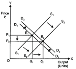 Let the initial equilibrium be at point E1, with the equilibrium price oP1 and the equilibrium outputoq1. Now, suppose that the demand increase toD2D2 and supply increases to S2S2. However, the increase in supply is more than that of the increase in demand. The new demand curve D2D2 and the new supply curve S2S2 intersect at point E2, with lower equilibrium price oP2. Thus, when the increase in demand is less than the increase in supply, the equilibrium price falls.