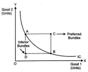 In the above figure, IC is the Indifference Curve. Each bundle on the IC shows those combinations of two goods that yield the consumer the same level of satisfaction.