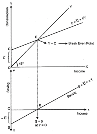 (ii) At point E (Y=). This implies that all the income is spent on consumption expenditure. Thus, savings equal to zero. This is shown as S = 0 in lower panel. This point is also known as the Break-even point.