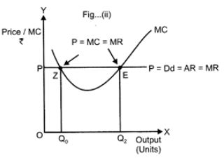 In the diagram, the MC curve cuts the price line (or MR) at two different points i.e., at ?Z5 and ?E5. The first order condition of profit maximization, i.e. Price (or MR = MQ is fulfilled at both these points.
