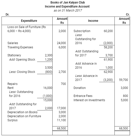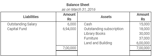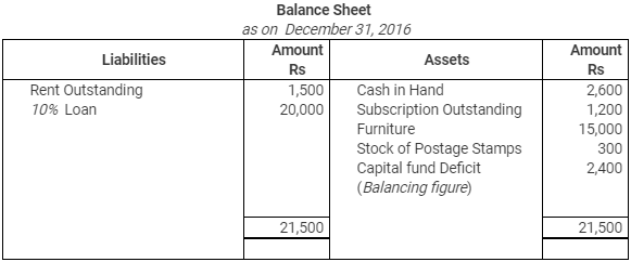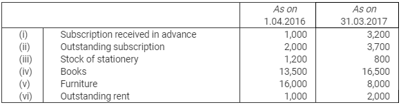 Subscription outstanding on March 31, 2016 is Rs 1, 200 and Rs 2,300 on March 31, 2017, opening stock of postage stamps is Rs 300 and closing stock is Rs 200, Rent Rs 1,500 related to 2015 and Rs 1,500 is still unpaid.