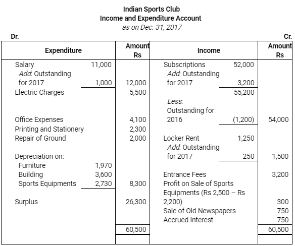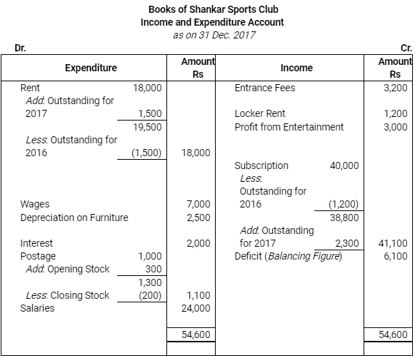 Subscription outstanding was on December 31, 2016 Rs 1,200 and Rs 3,200 on December 31, 2017. Locker rent outstanding on December 31, 2013 Rs 250. Salary outstanding on December 31, 2013 Rs 1,000.