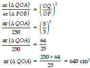 Q3: AB is a line segment. PB ⊥ AB and QA ⊥ AB are such that PO = 5 cm and QO = 8 cm. If ar (D POB) = 250 cm2, then find the area of D QOA.