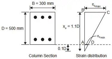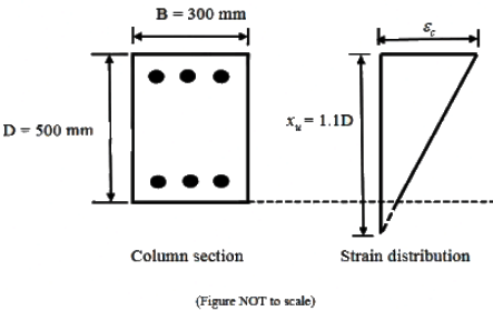 Q1: A concrete column section of size 300 mm × 500 mm as shown in the figure is subjected to both axial compression and bending along the major axis. The depth of the neutral axis (xu) is 1.1 times the depth of the column, as shown.”