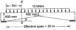 Q2: A haunched (varying depth) reinforced concrete beam is simply supported at both ends, as shown in the figure. The beam is subjected to a uniformly distributed factored load of intensity 10 kN/m. The design shear force (expressed in kN) at the section X-X of the beam is_______ . (Neglect variation of load due to change in section) [2016, Set-2]
