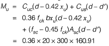 Q.14 A doubly reinforced rectangular concrete beam has a width of 300 mm and an effective depth of 500 mm. The beam is reinforced with 2200 mm2 of steel in tension and 628 mm2 of steel in compression. The effective cover for compression steel is 50 mm. Assume that both tension and compression steel yield. The grades of concrete and steel used are M20 and Fe250, respectively. The stress block parameters (rounded off to first two decimal places) for concrete shall be as per IS 456 : 2000. [2010 : 2 Marks]