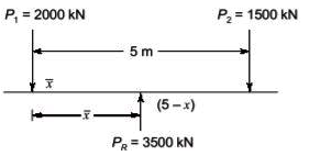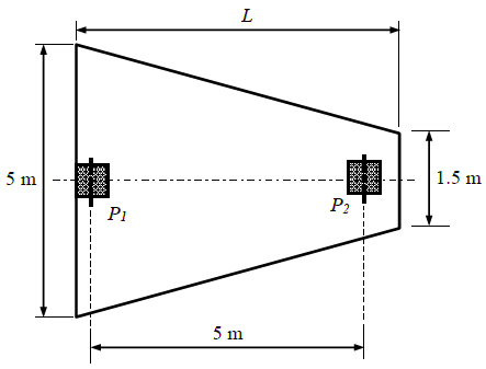 Q2: A combined trapezoidal footing of length L supports two identical square columns ( P1 and P2 ) of size 0.5 m × 0.5 m, as shown in the figure. The columns P1 and P2 carry loads of 2000 kN and 1500 kN, respectively. [2021, Set-1]