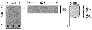 Q.11 The cross-section at mid-span of a beam at the edge of a slab is shown in the sketch. A portion of the slab is considered as the effective flange width for the beam. The grades of concrete and reinforcing steel are M25 and Fe415 respectively. The total area of reinforcing bars (As) is 4000 mm2. At the ultimate limit sate, xu denotes the depth of the neutral axis from the top fibre. Treat the section as under-reinforced and flanged (xu >100 mm).